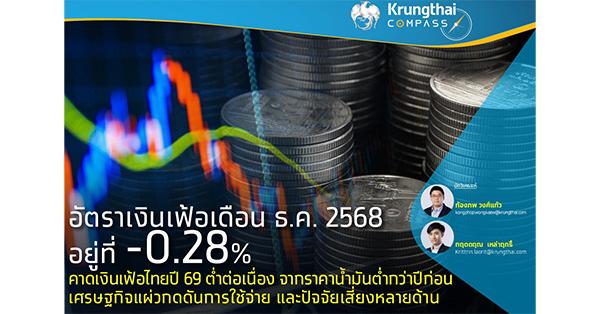 - Krungthai COMPASS คาดว่าอัตราเงินเฟ้อปี 69 ยังต่ำต่อเนื่อง จาก 1) แนวโน้มราคาน้ำมันโลกที่ต่ำกว่าปีก่อน และ 2) อุปสงค์ยังอ่อนแรง ตามภาวะเศรษฐกิจชะลอตัว อีกทั้งปัจจัยเสี่ยงต่อทิศทางเงินเฟ้อไทย ทั้งภาวะค่าเงินบาทที่แข็งค่า การตีตลาดของสินค้าจากต่างประเทศ รวมถึงแนวโน้มราคาน้ำมันโลกหลังเหตุการณ์ที่เวเนซุเอลา