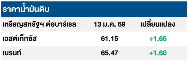 (+) ราคาน้ำมันดิบเวสต์เท็กซัสและเบรนท์ปรับเพิ่มขึ้น  หลังความเสี่ยงทางภูมิรัฐศาสตร์ในภูมิภาคตะวันออกกลางยังคงตึงเครียดอย่างต่อเนื่อง โดยล่าสุดนายโดนัลด์ ทรัมป์ ประธานธิบดีสหรัฐฯ ยังคงกระตุ้นให้ผู้ชุมนุมประท้วงต่อไป ซึ่งมีรายงานบ่งชี้ว่ามีผู้เสียชีวิตอย่างน้อย 648 ราย ในการประท้วงซึ่งเริ่มมานับตั้งแต่วันที่ 28 ธ.ค. 68 นอกจากนี้ รัฐมนตรีพลังงานของสหรัฐฯ ได้ให้สัมภาษณ์กับสำนักข่าว Fox News ว่าทางสหรัฐฯ พร้อมที่จะร่วมมือในการพัฒนาอุตสาหกรรมน้ำมันของอิหร่านเช่นเดียวกับในเวเนซุเอลา หากเกิดการเปลี่ยนแปลงระบอบการปกครองขึ้น