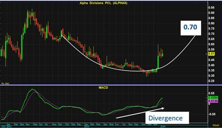 กราฟ ALPHAX ดีดตัวขึ้นจากระดับต่ำสุด และมีโครงสร้างเป็นกะทะหงาย โดย MACD เกิดการยกฐานขึ้นเป็นครั้งที่ 2 ทำให้เกิดสัญญาณแบบ Divergence ทางบวก และจะทำให้กราฟเริ่มปรับขึ้นตัวไปยังปลายขอบขวาที่ 0.70 บาท