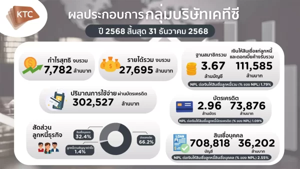 “กลุ่มบริษัทยังคงให้ความสำคัญกับการดำเนินธุรกิจด้วยความรอบคอบระมัดระวัง และติดตามสถานการณ์ต่างๆ อย่างใกล้ชิด เพื่อบริหารความเสี่ยงรอบด้านอย่างมีประสิทธิภาพ ด้วยการใช้ข้อมูลและระบบวิเคราะห์ขั้นสูง เพื่อรักษาคุณภาพหนี้และความมั่นคงทางการเงินในระยะยาว โดยคาดว่าในปี 2569 บริษัทฯ จะมีกำไรสุทธิมากกว่าปี 2568 พอร์ตสินเชื่อรวมเติบโตประมาณ 1-2% และคุม NPL ไม่เกิน 2% ปริมาณใช้จ่ายผ่านบัตรเครดิตเติบโต 5% และพอร์ตสินเชื่อส่วนบุคคลเติบโต 2% อย่างไรก็ตาม หากในปี 2569 เศรษฐกิจไทยมีความแข็งแกร่ง เคทีซีเชื่อว่าธุรกิจจะสามารถเติบโตได้ดีกว่าที่ประมาณการไว้”