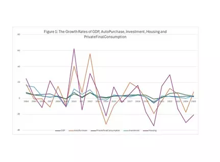 ภาวะเช่นนี้ มีส่วนสัมพันธ์กับตัวแปรเศรษฐกิจอื่น ๆ ด้วยดังแสดงใน Figure 1  การซื้อที่อยู่อาศัยกับรถยนต์มีความสัมพันธ์กันชัดเจนและมีขนาดความผันผวนสูงเหมือนกัน  ตัวแปร 2 ตัวข้างต้นยังมีความสัมพันธ์กับการลงทุน ซึ่งจะส่งผลกระทบต่อไปถึงอัตราการขายตัวทางเศรษฐกิจ  แต่ว่าความผันผวนของจีดีพีกับการลงทุนจะน้อยกว่าตัวแปรทั้งสองข้างต้นเป็นอย่างมาก  พฤติกรรมเช่นนี้อาจอนุมานได้ว่า การซื้อที่อยู่อาศัยกับรถยนต์ขึ้นอยู่กับภาวะเศรษฐกิจและรายได้เป็นอย่างมากและได้รับผลกระทบในขนาดที่มาก  ในทางตรงกันข้าม การเปลี่ยนแปลงของรายได้ในทางลบก็จะทำให้ผู้บริโภคหยุดการซื้อที่อยู่อาศัย/รถยนต์ในทันทีเช่นเดียวกันและมีขนาดที่รุนแรง  ถ้าจะกล่าวเป็นภาษาชาวบ้านก็คือ ที่อยู่อาศัย/รถยนต์ เป็นของไม่จำเป็นถ้าจะตัดก็ตัดได้ทันที ในขณะเดียวกันรายได้ที่ดีขึ้นก็จะกระตุ้นให้ผู้บริโภคซื้อสินค้าสองอย่างนี้ทันที ในทางเศรษฐศาสตร์ อาจกล่าวได้ว่า สำหรับคนไทยแล้ว  permanent income เป็น function ของรายได้ระยะสั้นมาก ๆ จึงเกิดพฤติกรรมดังที่แสดงใน Figure 1