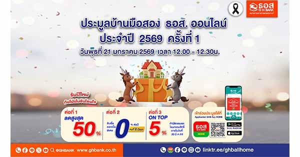 มิติหุ้น – ธนาคารอาคารสงเคราะห์ (ธอส.) จัดงานประมูลบ้านมือสองธอส. ออนไลน์ ประจำปี 2569 ครั้งที่ 1 ต้อนรับปีม้าอย่างยิ่งใหญ่นำทรัพย์คุณภาพดี ทำเลเด่น ราคาโดนใจ กว่า 1,600 รายการ ทั่วประเทศ ออกจำหน่ายลดราคาสูงสุดกว่า 50% จากราคาปกติ พร้อม ON TOP เพิ่มอีก 5% หากทำนิติกรรมและโอนกรรมสิทธิ์ภายในเวลาที่กำหนด และโปรโมชันสินเชื่อดอกเบี้ยพิเศษคงที่ 2 ปีแรก 0% ต่อปี พบกันในวันพุธที่ 21 มกราคม 2569 นี้ ผ่าน Application : GHB ALL HOME