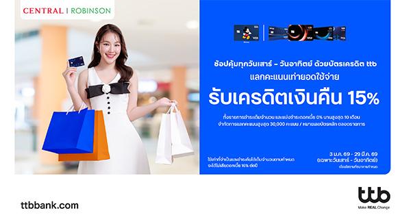 มิติหุ้น – ทีทีบี มอบประสบการณ์การช้อปปิ้งสุดคุ้มให้แก่ผู้ถือบัตรเครดิต ttb ผ่านแคมเปญ “Happy Weekend” ชวน ช้อปทุกวันเสาร์ – อาทิตย์ ที่ห้างสรรพสินค้าเซ็นทรัลและโรบินสันทุกสาขา ด้วยสิทธิพิเศษเมื่อใช้จ่ายแบบชำระเต็มจำนวนหรือแบ่งชำระ 0% นานสูงสุด 10 เดือน (สำหรับโรบินสันร่วมเฉพาะสาขาที่กำหนด) พร้อมรับเครดิตเงินคืน 15% เมื่อแลกคะแนนสะสมเท่ายอดใช้จ่าย จำกัดการแลกคะแนนสูงสุด 30,000 คะแนน / บัตรหลักตลอดรายการ ตั้งแต่วันที่ 3 มกราคม 2569 ถึง 29 มีนาคม 2569 ศึกษารายละเอียดเพิ่มเติมของโปรโมชัน ได้ที่ https://www.ttbbank.com/th/promotion/credit-card/shopping/central-edc-jan26 และ https://www.ttbbank.com/th/promotion/credit-card/shopping/robinson-edc-jan26