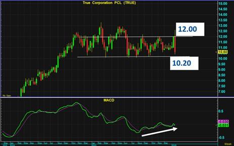 กราฟ TRUE  ปรับตัวลงแรง  และกำลังเข้าสู่แนว Support ที่ 10.20 บาท ซึ่งเป็นแนวแข็งแกร่งที่รับอยู่  อีกทั้ง MACD ยังอยู่แนวไต่ระดับ ไม่ได้เสียทรง จึงคาดว่ากราฟจะกลับมาดีดตัวไปยังแนวต้านเดิม 12 บาท