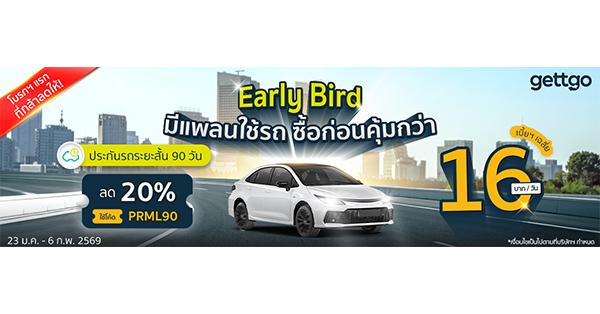 สำหรับผู้ที่วางแผนการใช้รถในช่วงนี้ไว้แล้ว ทาง gettgo ขอนำเสนอแคมเปญ Early Bird ส่วนลด 20% สำหรับประกันรถยนต์ระยะสั้น 90 วัน จากราคาแผนปกติ 1,850 บาท เหลือ 1,480 บาท หรือคิดเป็น ค่าเบี้ยเฉลี่ยประมาณ วันละ 16 บาท พร้อมความคุ้มครองตลอดระยะเวลา 90 วัน สามารถเลือกวันคุ้มครองล่วงหน้าได้ 90 วัน โดยผู้สนใจสามารถใช้โค้ด PRML90 ก่อนชำระเงินผ่านเว็บไซต์ https://s.gettgo.com/prmonthly90 ตั้งแต่วันที่ 23 มกราคม – 6 กุมภาพันธ์ 2569
