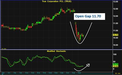 กราฟ TRUE  ปรับตัวลงแรง  จนเกิดช่องว่างตั้งแต่ 11.70 บาทลงมา ขณะที่กราฟเริ่มก่อตัวมีโครงสร้าง TF60 คล้าย V-Shape ขณะที่ Stoch เกิด Oversold ดังนั้นกราฟจะดีดตัวขึ้นไปยังแนว Open Gap ดังกล่าวในไม่ช้า