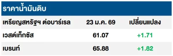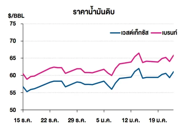 (+) ตลาดได้รับแรงหนุนจากสภาพอากาศหนาวจัดในสหรัฐฯ หลังสำนักงานอุตุนิยมวิทยาแห่งชาติของสหรัฐฯ เผยว่าพายุฤดูหนาว “เฟิร์น (Fern)”ส่งผลกระทบต่อหลายพื้นที่ของสหรัฐฯ โดยล่าสุดการผลิตน้ำมันดิบที่รัฐนอร์ทดาโคตา (North Dakota) ได้รับผลกระทบจากเหตุการณ์ดังกล่าว ส่งผลให้กำลังผลิตปรับลดลงราว 0.11 ล้านบาร์เรลต่อวัน