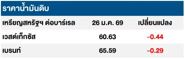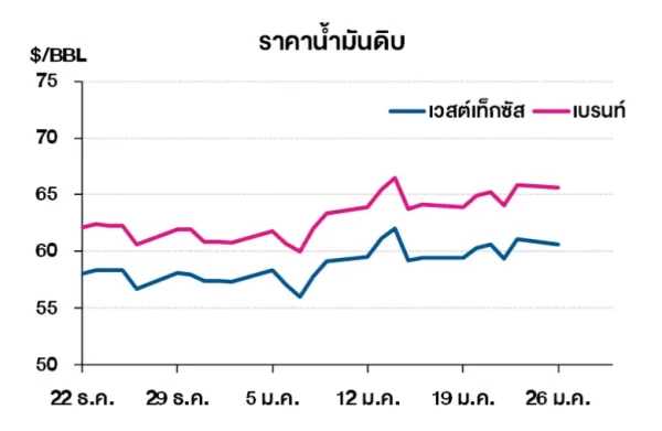 (-) ราคาน้ำมันดิบเวสต์เท็กซัสและเบรนท์ปรับลดลง จากการคาดการณ์ปริมาณน้ำมันดิบส่วนเพิ่มจากคาซัคสถานที่สามารถกลับมาผลิตน้ำมันดิบจากแหล่งน้ำมันดิบภายในประเทศได้อีกครั้ง หลังเกิดเหตุไฟฟ้าดับเมื่อวันที่ 18 ม.ค. 69 ที่ผ่านมา ส่งผลให้ต้องหยุดการผลิตน้ำมันดิบชั่วคราว ทั้งนี้ คาซัคสถานยังสามารถกลับมาส่งน้ำมันดิบผ่านทาง Caspian Pipeline Consortium (CPC) ที่ใช้ส่งออกน้ำมันดิบจากคาซัคสถานสู่ทะเลดำได้อีกครั้ง หลังเสร็จสิ้นการปิดซ่อมบำรุงหนึ่งในสามของจุดจอดเรือ