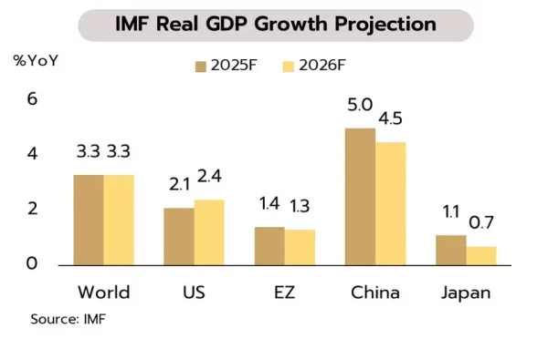 โลก: IMF คาดการเติบโตของเศรษฐกิจโลกทรงตัวที่ระดับ 3.3% ในปี 2569 ท่ามกลางแรงหนุนจากการลงทุนในกลุ่มเทคโนโลยี โดยเศรษฐกิจสหรัฐฯ โตต่ำ ส่วนยูโรโซน จีน และญี่ปุ่นชะลอตัว อย่างไรก็ตาม ความเสี่ยงยังโน้มไปทางขาลงจากความไม่แน่นอนเกี่ยวกับนโยบายการค้า ฟองสบู่ในภาค AI รวมถึงความตึงเครียดทางภูมิรัฐศาสตร์ ที่อาจกระทบต่อห่วงโซ่อุปทาน การลงทุน และความเชื่อมั่น