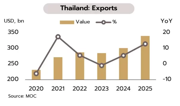 ไทย: ส่งออกเดือนธันวาคมโตแรง 16.8% หนุนทั้งปี 2568 ขยายตัวเกินคาดที่ 12.9% แต่โมเมนตัมมีแนวโน้มชะลอลงในปี 2569 มูลค่าส่งออกในเดือนธันวาคมอยู่ที่ 28.9 พันล้านดอลลาร์ ขยายตัวต่อเนื่องเป็นเดือนที่ 18 ที่ 16.8% YoY ตามการเติบโตของการส่งออกในกลุ่มอิเล็กทรอนิกส์และเครื่องใช้ไฟฟ้า โดยยังขยายตัวแข็งแกร่งในตลาดสหรัฐฯ ภาพรวมทั้งปี 2568 มีมูลค่าการส่งออกรวม 339.6 พันล้านดอลลาร์ ขยายตัว 12.9% สูงสุดในรอบ 4 ปี