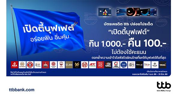 โดยมีร้านบุฟเฟต์ชื่อดังมากกว่า 50 ร้านทั่วประเทศ ครอบคลุมกลุ่มปิ้งย่าง ชาบู ซูชิ และบุฟเฟต์นานาชาติ เพื่อรองรับความหลากหลายของไลฟ์สไตล์ลูกค้าในทุกกลุ่ม อาทิ AKA, Akiyoshi, Kagonoya, MK Restaurants, Mo-Mo-Paradise / Mo-Mo-Paradise Gold, Nene Grill, Oishi Eaterium / Oishi Grand, Shabushi, You&I Premium Suki Buffet ที่พร้อมมอบความคุ้มค่าให้ลูกค้าบัตรเครดิต ttb รับเครดิตเงินคืนทันที 100 บาท เมื่อใช้จ่ายครบ 1,000 บาท / เซลล์สลิป แบบไม่ต้องแลกคะแนน และรับเงินคืนสูงสุด 400 บาท / ท่านตลอดรายการ ตั้งแต่วันที่ 1 มกราคม 2569 – 31 มีนาคม 2569 ลูกค้าสามารถลงทะเบียนเพียงครั้งเดียวผ่านแอป ttb touch เพื่อรับสิทธิ์ตลอดระยะเวลาแคมเปญ ศึกษารายละเอียดเพิ่มเติมของแคมเปญและรายชื่อร้านอาหารที่ร่วมรายการ ได้ที่ https://www.ttbbank.com/link/fbweb-buffet-jan26