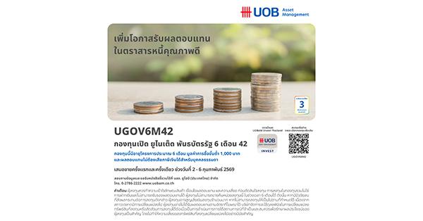 มิติหุ้น – บริษัทหลักทรัพย์จัดการกองทุน ยูโอบี (ประเทศไทย) จำกัด หรือ บลจ.ยูโอบี ได้เสนอขายหน่วยลงทุนครั้งแรก (IPO) กองทุนเปิด ยูไนเต็ด พันธบัตรรัฐ 6 เดือน 42 (UGOV6M42) อายุประมาณ 6 เดือน มีประมาณการผลตอบแทน 0.95% ต่อปี (ข้อมูลจากอัตราผลตอบแทนที่เสนอโดยผู้ออกตราสาร หรือจากผู้ขาย ณ วันที่ 28 มกราคม 2569) ขนาดโครงการ 10,000 ล้านบาท โดยเสนอขายในราคา 10 บาทต่อหน่วย และยอดลงทุนขั้นต่ำครั้งแรก 1,000 บาท