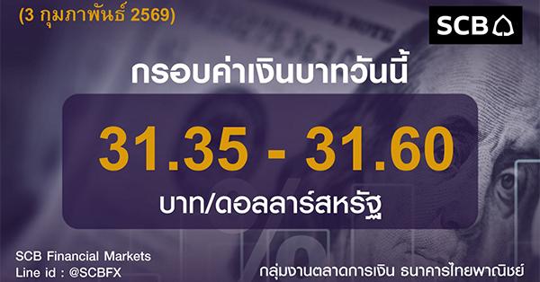 - กลุ่มงานตลาดการเงิน ธนาคารไทยพาณิชย์ ประเมินค่าเงินบาทวันนี้เคลื่อนไหวในกรอบ 31.35-31.60 บาท/ดอลลาร์