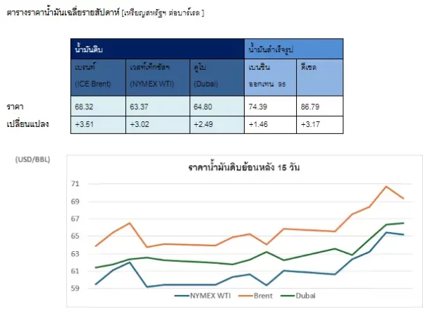 - กระทรวงพลังงานคาซัคสถานประกาศแหล่งผลิตน้ำมันดิบ Tengiz (950,000 บาร์เรลต่อวัน) ในคาซัคสถาน สามารถกลับมาดำเนินการบางส่วน หลังหยุดดำเนินการจากเหตุเพลิงไหม้และไฟฟ้าดับตั้งแต่วันที่ 18 ม.ค. 69 อย่างไรก็ดี อนึ่ง การผลิตน้ำมันดิบของคาซัคสถานในเดือน ม.ค. 69 เฉลี่ยที่ 1.0–1.1 ล้านบาร์เรลต่อวัน ลดลงจากระดับปกติที่ราว 1.8 ล้านบาร์เรลต่อวัน