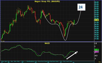 กราฟ MAGURO กำลังสร้างรูปแบบทรงมดลูก โดยมีปลายปีกด้านขวาขึ้นไปสูงถึง 24 บาท ขณะที่ MACD ดีดตัวขึ้นยกฐานเป็นสัญญาณซื้อสนับสนุน Buy signal นี้ และจะสร้าง new high ต่อๆไปในแบบขาขึ้นระยะกลาง