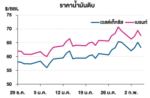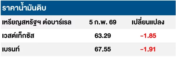 (+/-) สำนักข่าวบลูมเบิร์ก (Bloomberg) เผยตัวเลขมูลค่าการส่งออกน้ำมันของรัสเซียในเดือน ม.ค. 69 ปรับลดลงราว 50 % เมื่อเทียบกับช่วงเดียวกันของปีก่อนหน้า สู่ระดับ 3.7 พันล้านเหรียญสหรัฐฯ ซึ่งถือเป็นระดับที่ต่ำที่สุดในรอบกว่า 5 ปี โดยมูลค่าการส่งออกที่ปรับลดลงได้รับผลกระทบจากราคาขายน้ำมันดิบซึ่งปรับลดลง ทั้งนี้คาดว่าการปรับลดลงของมูลค่าการส่งออกนี้จะกดดันงบประมาณในการทำสงครามของรัสเซีย ขณะที่ล่าสุด สำนักข่าว Reuters เผยว่าการประชุมไตรภาคี (Trilateral meeting) ระหว่างสหรัฐฯ รัสเซียและยูเครน ที่สหรัฐอาหรับ เอมิเรตส์ มีทิศทางเชิงบวก หลังรัสเซียและยูเครนบรรลุข้อตกลงแลกเปลี่ยนเชลยศึกจำนวน 314 คนเป็นครั้งแรกในรอบ 5 เดือน