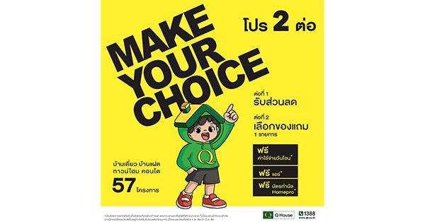 QH จัดแคมเปญ “MAKE YOUR CHOICE โปร 2 ต่อ” รับส่วนลดสูงสุด 2,500,000 บ.* พร้อมฟรีของแถมให้คุณเลือกได้* กับ 57 โครงการ บ้านเดี่ยว บ้านแฝด ทาวน์โฮม และคอนโดมิเนียม บนทำเลกรุงเทพฯ ปริมณฑล ชลบุรี เชียงใหม่ ตั้งแต่ 9 ก.พ. – 31 มี.ค. 2569 เท่านั้น