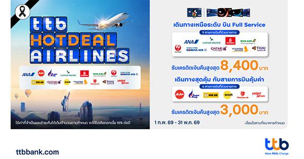 ทั้งนี้ ผู้ถือบัตรเครดิต ttb จะต้องชำระค่าบัตรโดยสารแบบเต็มจำนวนผ่านช่องทางเว็บไซต์ หรือโมบายแอปพลิเคชัน หรือเคาน์เตอร์จำหน่ายบัตรโดยสารของสายการบินโดยตรงเท่านั้น กับ 15 สายการบินชั้นนำที่ร่วมรายการ ตั้งแต่วันที่ 1 กุมภาพันธ์ 2569 – 31 พฤษภาคม 2569 โดยลูกค้าสามารถลงทะเบียนรับสิทธิ์ผ่านแอป ttb touch ศึกษารายละเอียดเพิ่มเติมของโปรโมชัน ได้ที่ https://www.ttbbank.com/th/promotion/credit-card/travel/airfull-feb26 และ https://www.ttbbank.com/th/promotion/credit-card/travel/otherair-feb26