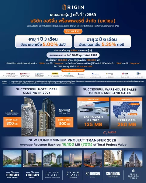มิติหุ้น – ออริจิ้น เดินหน้าสร้างรายได้ต่อเนื่อง ล่าสุดขายคลังสินค้าเข้ากอง REIT แบรนด์ แอลฟา (ALPHA) คว้า Extra Cash 125 ล้านบาทตามแผน พร้อมจำหน่ายทรัพย์สินที่ดินพร้อมพัฒนา 2 แปลง รับ Extra Cash 260 ล้านบาท อีกทั้งในปี 2569 นี้ มี Backlog คอนโดฯ 7 โครงการที่พร้อมโอนให้ลูกค้า มูลค่ากว่า 16,000 ล้านบาท ช่วยลดความเสี่ยงจากความผันผวนของธุรกิจ พร้อมเสนอขายหุ้นกู้ครั้งที่ 1/2569 ระหว่าง 10-12 กุมภาพันธ์ นี้ จำนวน 2 ชุด ชุดที่ 1 หุ้นกู้อายุ 1 ปี 3 เดือน อัตราดอกเบี้ย 5.00% และ ชุดที่ 2 หุ้นกู้อายุ 2 ปี 6 เดือน อัตราดอกเบี้ย 5.35% จ่ายดอกเบี้ยทุก 3 เดือน
