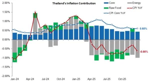 อจะยังคงอยู่ในทิศทางหดตัวต่ อเนื่องในช่วงไตรมาส 1 ปี 2026 แม้จะมีแรงสนับสนุนจากราคาผั กสดที่เพิ่มขึ้น และยานยนต์ จากการปรับโครงสร้างการขึ้นภาษี สรรพสามิตที่มีผลตั้งแต่วันที่ 1 ม.ค. 2026 อย่างไรก็ตาม การใช้จ่ายที่เกิดขึ้นในช่ วงของการเลือกตั้งทั่วไปในเดือน ก.พ. อาจยังไม่เพียงพอที่จะช่วยหนุ นเงินเฟ้อฟื้นตัว ประกอบกับมาตรการลดราคาโดยผู้ค้ าปลีกรายใหญ่ และการปรับลดค่าไฟฟ้า (Ft) ของภาครัฐที่ยังลดต่อเนื่องจนถึ งเดือน เม.ย. 2026 รวมถึงราคาพลังงานที่ยังอยู่ ในระดับต่ำ ล้วนส่งผลให้แรงกดดันเงินเฟ้ ออยู่ในระดับต่ำ -