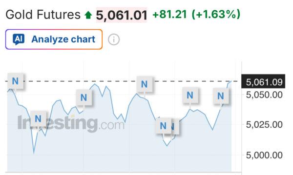 มิติหุ้น – ราคาทองฟิวเจอร์พุ่งขึ้น 81ดอลลาร์ ล่าสุดสัญญาทองคำตลาด COMEX (Commodity Exchange) ส่งมอบเดือน เม.ย. บวก 81.21 ดอลลาร์ หรือ 1.63% สู่ระดับ 5,061.01 ดอลลาร์/ออนซ์