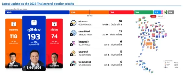 สรุปผลการเลือกตั้งปี 2569 ล่าสุดอย่างไม่เป็นทางการ (นับแล้ว 94%) พรรคภูมิใจไทยครองที่นั่งสมาชิ
