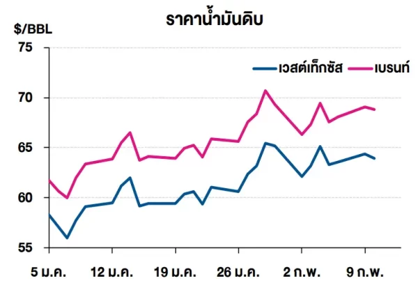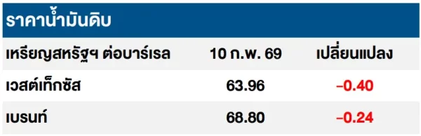 (-) ราคาน้ำมันดิบเวสต์เท็กซัสและเบรนท์ปรับลดลงเล็กน้อย หลังตลาดยังคงรอสัญญาณการเจรจาทางการทูตระหว่างสหรัฐฯ และอิหร่านโดยวันที่ 10 ก.พ. 69  โฆษกกระทรวงการต่างประเทศของอิหร่าน ได้กล่าวว่า หากการเจรจาสามารถทำให้อิหร่านประเมินว่าสหรัฐฯ มีความมุ่งมั่นที่จะดำเนินการตามกรอบการเจรจา อิหร่านก็พร้อมเดินหน้ากระบวนการทางการทูตต่อไป ในขณะที่ประธานาธิบดีสหรัฐฯ โดนัลด์ ทรัมป์ ระบุว่าอิหร่านจำเป็นต้องทำขอตกลงกับสหรัฐฯ เกี่ยวกับโครงการนิวเคลียร์และขีปนาวุธ