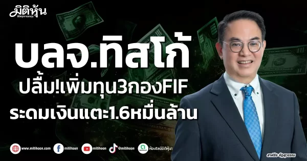 มิติหุ้น – นายสาห์รัช ชัฏสุวรรณ กรรมการผู้จัดการ บลจ. ทิสโก้ เปิดเผยว่า บลจ.ทิสโก้ประกาศเพิ่มทุนจำนวน 3 กองทุนตามความต้องการของลูกค้า ได้แก่ 1. กองทุนเปิด ทิสโก้ไชน่า เทคโนโลยีอิควิตี้ (TCHTECH) อีกจํานวน 1,000 ล้านบาท รวมเป็นจํานวนเงินทุนโครงการทั้งสิ้น 6,000 ล้านบาท 2. กองทุนเปิด ทิสโก้อีเมอร์จิ้ง มาร์เก็ต เอ็กซ์ไชน่า (TEMxCH) อีกจํานวน 1,000 ล้านบาท รวมเป็นจํานวนเงินทุนโครงการทั้งสิ้น 4,000 ล้านบาท 3. กองทุนเปิด ทิสโก้โกลบอล สมาร์ท แอลโลเคชั่น (TGSMART) อีกจํานวน 2,000 ล้านบาท รวมเป็นจํานวนเงินทุนโครงการทั้งสิ้น 6,000 ล้านบาท