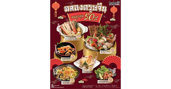 • ฉลองตรุษจีน ลดสะใจ 50% กับ 6 เมนูซิกเนเจอร์ (วันนี้ – 28 ก.พ.): จัดเต็มความอร่อยระดับพรีเมียมสำหรับครอบครัว อาทิ ปูทาราบะนึ่ง, ปลาดิบรวมพิเศษ (Tokumori), กุ้งเทมปุระ, แซลมอนซัมมัย, สลัดปลาเงิน และแซลมอนสไปซี่ยำ ในราคาเริ่มต้นเพียง 159 – 1,699 บาท (ให้บริการทุกสาขา ยกเว้นสาขาเดอะพอร์ทอล)