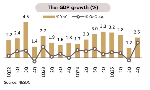 ไทย: GDP ไตรมาส 4 ปี 2568 โตเกินคาด แต่แรงส่งการเติบโตอาจแผ่วลงในปี 2569 สภาพัฒน์ฯ รายงานเศรษฐกิจไทยในไตรมาส 4 ขยายตัว 2.5% YoY เร่งขึ้นจาก 1.2% ในไตรมาส 3 และเติบโตดีกว่าที่วิจัยกรุงศรีและตลาดคาดไว้ที่ 1.2% และ 1.3% ตามลำดับ แรงขับเคลื่อนหลักมาจากการบริโภคและการลงทุนของทั้งภาครัฐและภาคเอกชนที่เร่งตัวขึ้น ขณะที่การส่งออกสินค้าและบริการชะลอตัวลง สำหรับในปี 2569 สภาพัฒน์ฯ ปรับเพิ่มคาดการณ์ GDP เติบโตที่ 1.5-2.5% (ค่ากลางที่ 2.0%) จาก 1.2-2.2% (ค่ากลางที่ 1.7%)
