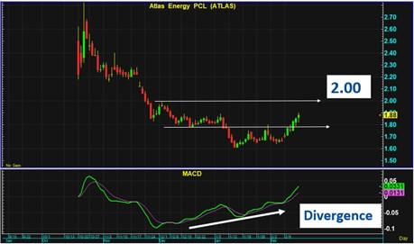 กราฟ ATLAS ดีดตัวขึ้น จากแนวต่ำสุด และกำไรฟื้นตัวขึ้นทดสอบแนวไหล่ขวาครั้งแรก โดย MACD ยกฐานขึ้นเป็นครั้งที่สองในโครงสร้าง Divergence ซึ่งจะทำให้กราฟดีดตัวขึ้นทดสอบแนว 2 บาทเป็นแนวต้านถัดไป
