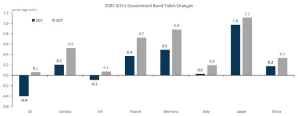 - ด้วยเหตุนี้ สหรัฐฯ จึงกลายเป็นประเทศเดียวที่อัตราผลตอบแทนพัธบัตรอายุ 10 ปีปรับลดลงอย่างมีนัยในปีที่ผ่านมา เมื่อเทียบกับประเทศอื่นในกลุ่ม G7 นอกจากนี้ อัตราผลตอบแทนพันธบัตรรัฐบาลสหรัฐฯ อายุ 30 ปี ซึ่งมักถูกหยิบยกมาเป็นประเด็นถกเถียงเกี่ยวกับเสถียรภาพทางการคลัง กลับเป็นเพียงไม่กี่ตลาดในกลุ่มประเทศพัฒนาแล้วที่อัตราผลตอบแทนปรับเพิ่มขึ้นเพียงเล็กน้อยเท่านั้น (+0.1 ppts) ขณะที่ประเทศอื่นส่วนใหญ่กลับมีอัตราผลตอบแทนที่ปรับเพิ่มขึ้นอย่างชัดเจน อาทิ พันธบัตรรัฐบาลญี่ปุ่น (+1.1 ppts) และพันธบัตรรัฐบาลเยอรมันนี (+0.9 ppts)