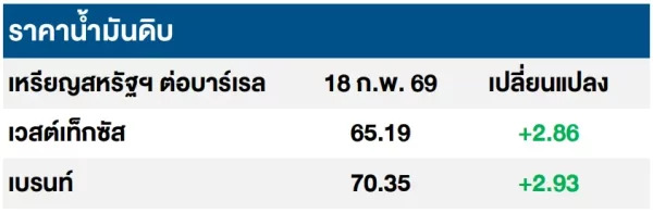 (+) สถาบันปิโตรเลียมด้านพลังงานสหรัฐฯ (API) รายงานปริมาณน้ำมันดิบคงคลังสหรัฐฯ ประจำสัปดาห์สิ้นสุดวันที่ 13 ก.พ. 69 ปรับลดลง 0.6 ล้านบาร์เรล สวนทางกับที่นักวิเคราะห์คาดการณ์ไว้ว่าจะเพิ่มขึ้น 2.1 ล้านบาร์เรล