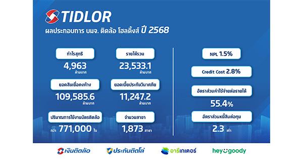 มิติหุ้น – 19 กุมภาพันธ์ 2569 – บริษัท ติดล้อ โฮลดิ้งส์ จำกัด (มหาชน) หรือ Tidlor Holdings หรือ กลุ่มบริษัท (TIDLOR) ประกาศความสำเร็จผลการดำเนินงานประจำปี 2568 โดย นางสาวชลธิชา ทองไทย ผู้บริหารระดับสูงฝ่ายบัญชีและการเงิน (CFO) เปิดเผยว่า ภาพรวมผลการดำเนินงานในปีที่ผ่านมา กลุ่มบริษัทสามารถทำกำไรสุทธิสถิติสูงสุดใหม่ที่ 4,963 ล้านบาท เพิ่มขึ้น 17.4% เมื่อเทียบกับปีก่อน (YoY) ซึ่งเป็นผลสำเร็จจากการขับเคลื่อนธุรกิจภายใต้กลยุทธ์การเติบโตอย่างมีคุณภาพทั้งธุรกิจสินเชื่อทะเบียนรถและธุรกิจนายหน้าประกันภัย ควบคู่กับการบริหารคุณภาพสินเชื่อและต้นทุนอย่างรอบคอบ โดยในปี 2568 กลุ่มบริษัทมีรายได้รวม 23,533.1 ล้านบาท เพิ่มขึ้น 6.2% (YoY) โดยมีแรงขับเคลื่อนหลักจากรายได้ดอกเบี้ยรับตามการขยายตัวของพอร์ตสินเชื่อ และรายได้ค่าธรรมเนียมและบริการจากธุรกิจนายหน้าประกันภัย ซึ่งยังคงเป็นหนึ่งในแหล่งรายได้สำคัญ นอกจากนี้ยังสามารถขยายฐานลูกค้าของทั้งสองธุรกิจได้อย่างต่อเนื่องจากช่องทางการจำหน่ายหลากหลาย (Omni-Channel) และในปี 2568 มีสาขารวมทั้งสิ้น 1,873 แห่ง ทั่วประเทศ