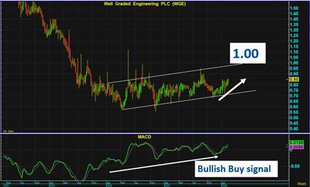 กราฟ WGE  เคลื่อนไหวในแนว Sideway Up โดย MACD ยกฐานสูงขึ้นอย่างต่อเนื่อง เรียกว่า Buy signal Divergence ซึ่งจะทำให้กราฟแท่ง เทียนเดินหน้าในระยะกลางจากนี้ไป โดยมีแนวต้านสำคัญ 1 บาท หากผ่านได้จะกลับเป็นขาขึ้น