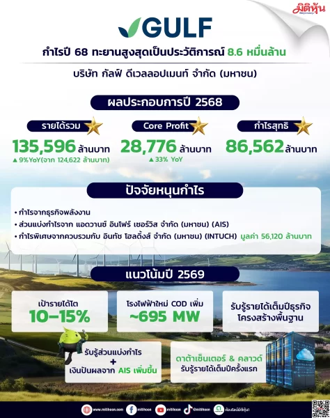 Infographics GULF กำไรปี 68 ทะยานสูงสุดเป็นประวัติการณ์ 8.6 หมื่นล้าน 20 กุมภาพันธ์ 2026 / เวลา 18:00 น. 54 แบ่งปัน FacebookTwitterWhatsAppTelegramLINECopy URL