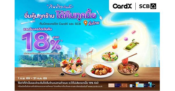มิติหุ้น – กรุงเทพฯ, 24 กุมภาพันธ์ 2569 – CardX ผู้ให้บริการบัตรเครดิตและสินเชื่อบุคคลภายใต้กลุ่มเอสซีบีเอกซ์ เดินหน้ากระตุ้นการจับจ่ายหมวดร้านอาหาร รับกระแสไลฟ์สไตล์คนไทยที่นิยมทานอาหารนอกบ้านและสังสรรค์มากขึ้น ผ่านแคมเปญ “กินข้าวกันมั๊ย อิ่มคุ้มทุกร้าน ได้คืนทุกมื้อทั่วไทย” มอบสิทธิประโยชน์สุดคุ้มให้ผู้ถือบัตรเครดิต CardX และ SCB แลกรับเครดิตเงินคืนสูงสุด 18%* ณ ร้านอาหารที่ร่วมรายการทั่วประเทศ ตั้งแต่วันที่ 1 กุมภาพันธ์ 2569 – 31 กรกฎาคม 2569