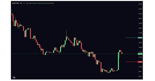 Synthetix (SNX) ทำผลตอบแทน 39.38% ในสัปดาห์ที่ผ่านมา ราคากำลังพักตัวลงหลังพุ่งแรงก่อนหน้านี้ หากยืนเหนือแนวรับ 0.317 ดอลลาร์สหรัฐได้ แนวโน้มฟื้นตัวยังมีต่อเนื่อง เป้าหมายขายทำกำไรอยู่ที่แนวต้าน 0.521 ดอลลาร์สหรัฐ
