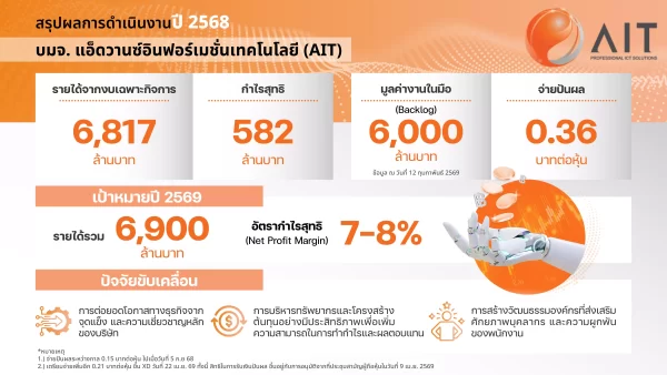 บริษัทฯ ตั้งเป้าหมายรายได้ปี 2569 ไว้ที่ 6,900 ล้านบาท โดยให้ความสำคัญกับการบริหารจัดการต้นทุนอย่างเป็นระบบเพื่อรักษาระดับอัตรากำไรสุทธิ (Net Profit Margin) ให้อยู่ที่ 7-8% ผ่าน 3 กรอบกลยุทธ์หลัก คือ 1.) การต่อยอดโอกาสทางธุรกิจจากจุดแข็งและความเชี่ยวชาญหลักของบริษัท 2.) การบริหารทรัพยากรและโครงสร้างต้นทุนอย่างมีประสิทธิภาพ เพื่อเพิ่มความสามารถในการทำกำไรและผลตอบแทน และ 3.) การสร้างวัฒนธรรมองค์กรที่ส่งเสริมศักยภาพบุคลากรและความผูกพันของพนักงาน ซึ่งจะเป็นรากฐานสำคัญในการขับเคลื่อนการเติบโตอย่างมั่นคงและยั่งยืนในระยะยาว ปัจจุบัน AIT มีมูลค่างานในมือ (Backlog) ณ วันที่ 12 กุมภาพันธ์ 2569 อยู่ที่ประมาณ 6,000 ล้านบาท ทั้งนี้ บริษัทฯ เชื่อมั่นว่าด้วยรากฐานที่มั่นคง จะช่วยให้ AIT ก้าวขึ้นแท่นผู้นำอุตสาหกรรมเทคโนโลยีสารสนเทศและการสื่อสารของประเทศไทยในอนาคต