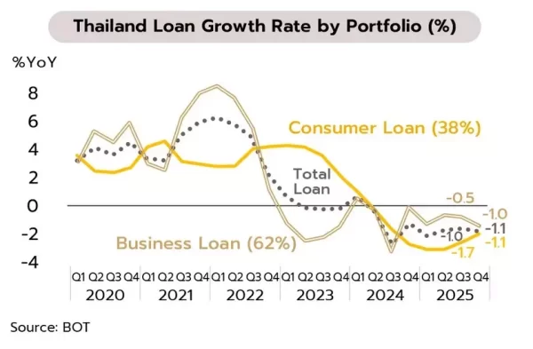 ไทย: สินเชื่อในระบบธนาคารพาณิชย์ ไตรมาส 4 ปี 2568 หดตัว 1.1% YoY ใกล้เคียงกับการหดตัว 1.0% ในไตรมาส 3 เป็นผลมาจากการหดตัวของสินเชื่อธุรกิจ ทั้งสินเชื่อธุรกิจขนาดใหญ่และสินเชื่อธุรกิจ SMEs สำหรับคุณภาพสินเชื่อ อัตราส่วน NPLs รวมปรับลดลงมาอยู่ที่ 2.84% จาก 2.94% ของสินเชื่อรวม จากการชำระคืนหนี้เป็นสำคัญ ส่วนสินเชื่อ Stage 2 ขยับลงมาอยู่ที่ 7.07% จาก 7.24% ของสินเชื่อรวม จากการชำระหนี้ได้ตามการปรับโครงสร้างหนี้เป็นสำคัญ