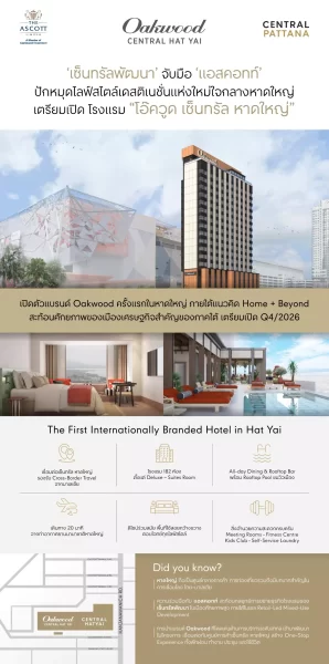 มิติหุ้น – บริษัท เซ็นทรัลพัฒนา จำกัด (มหาชน) ผู้นำเบอร์หนึ่งอสังหาริมทรัพย์ไทยเพื่อความยั่งยืน พัฒนาและบริหารศูนย์การค้า, ที่อยู่อาศัย, โรงแรม และอาคารสำนักงานทั่วประเทศไทย ร่วมกับ ดิ แอสคอทท์ ลิมิเต็ด (แอสคอทท์) ผู้ให้บริการด้านที่พักและโรงแรมชั้นนำระดับโลก ภายใต้เครือ CapitaLand Investment (CLI) ประกาศพัฒนาโครงการ โรงแรมโอ๊ควูด เซ็นทรัล หาดใหญ่ (Oakwood Central Hat Yai) นับเป็นการเปิดตัวแบรนด์ Oakwood ครั้งแรกในหาดใหญ่ สะท้อนศักยภาพของเมืองเศรษฐกิจสำคัญของภาคใต้ และตอกย้ำการยกระดับมาตรฐานที่พักและการบริการ โดยโรงแรมตั้งอยู่ในทำเลศักยภาพ เชื่อมต่อโดยตรงกับศูนย์การค้าเซ็นทรัล หาดใหญ่ ศูนย์กลางไลฟ์สไตล์และแลนด์มาร์คสำคัญของเมือง โดยใช้เวลาเดินทางจากท่าอากาศยานนานาชาติหาดใหญ่เพียง 20 นาที ตอบโจทย์ทั้งการพักผ่อนและการใช้ชีวิตใจกลางเมืองได้อย่างสมบูรณ์แบบ พร้อมเตรียมเปิดให้บริการในไตรมาส 4 ปี 2569