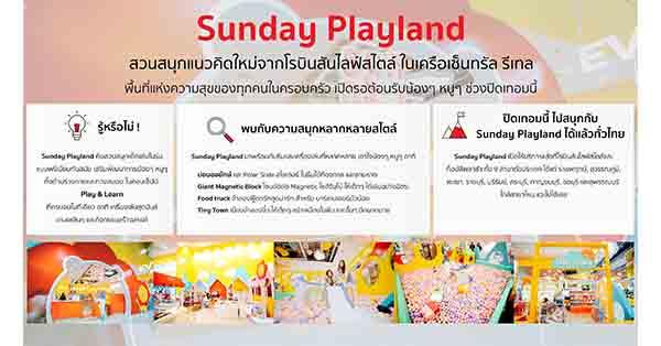 Sunday Playland คือธุรกิจภายใต้การดูแลของศูนย์การค้าโรบินสันไลฟ์สไตล์ ในเครือเซ็นทรัลรีเทล ปัจจุบันเปิดดำเนินการแล้ว 9 สาขาทั่วประเทศ ได้แก่ ราชพฤกษ์, สุวรรณภูมิ, พะเยา, ราชบุรี, บุรีรัมย์, สระบุรี, กาญจนบุรี, ชลบุรี และ สุพรรณบุรี พร้อมต้อนรับน้องๆ หนูๆ โดยเฉพาะช่วงปิดเทอมที่ใกล้จะถึงนี้