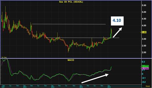 กราฟ SEAOIL เคลื่อนไหวในแนว Sideway Up โดย MACD ยกฐานสูงขึ้นอย่างต่อเนื่อง เกิด Buy signal ซึ่งจะทำให้กราฟแท่งเทียนเดินหน้าจากนี้ไป โดยมีแนวต้านสำคัญ 4.10 บาท