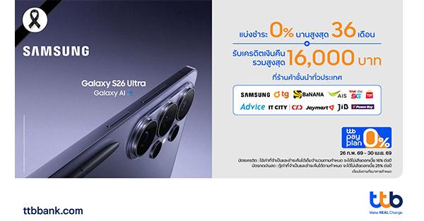 มิติหุ้น – ทีทีบี เดินหน้ามอบสิทธิพิเศษด้านการใช้จ่ายอย่างคุ้มค่าและยืดหยุ่นมากขึ้นให้กับลูกค้าบัตรเครดิตและบัตรกดเงินสด ttb ด้วยการผนึกกำลังกับซัมซุงและพันธมิตรร้านค้าชั้นนำ จัดแคมเปญเพื่อให้ลูกค้าเข้าถึงเทคโนโลยีระดับแฟลกชิปอย่าง Samsung Galaxy S26 Series ได้ง่ายขึ้น ตอบโจทย์ไลฟ์สไตล์ดิจิทัลของลูกค้าอย่างแท้จริง ด้วยโปรโมชันสุดพิเศษ สำหรับลูกค้าบัตรเครดิตและบัตรกดเงินสด ttb ที่ซื้อ Samsung Galaxy S26 Series ทุกรุ่นที่ร่วมรายการ ตั้งแต่ 30,000 บาทขึ้นไป / เซลล์สลิป และทำรายการแบ่งชำระ 0% รับเครดิตเงินคืนรวมสูงสุด 16,000 บาท