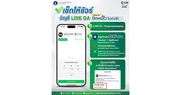 ทั้งนี้ ลูกค้าที่ผ่านคุณสมบัติเข้าโครงการฯ จะต้องยืนยันตัวตนผ่านช่องทาง LINE Official Account @samsocialamc โดยกรอกข้อมูลตามที่กำหนดให้ครบถ้วน และ SAM ขอให้ความเชื่อมั่นว่ากระบวนการแสดงตนของลูกค้าในโครงการ “ปิดหนี้ไว ไปต่อได้” ผ่านช่องทาง Line Official Account@samsocialamc มีความน่าเชื่อถือ ปลอดภัย อยู่ภายใต้มาตรฐานและสอดคล้องกับประกาศสำนักงาน ปปง. เรื่องแนวทางในการระบุตัวตนและพิสูจน์ทราบตัวตนของลูกค้า