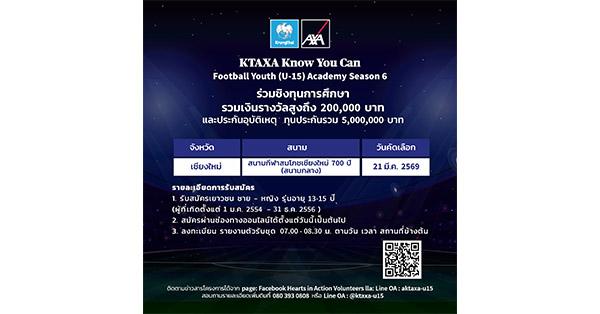 มิติหุ้น – บมจ.กรุงไทย-แอกซ่า ประกันชีวิต เปิดรับสมัครเยาวชนภาคเหนือ เข้าร่วมโครงการ KTAXA Know You Can Football Youth (U-15) Academy Season 6 เพื่อชิงทุนการศึกษามูลค่าสูงถึง 200,000 บาท และประกันอุบัติเหตุ ทุนประกันรวมกว่า 5,000,000 บาท ซึ่งเปิดโอกาสให้เยาวชนอายุระหว่าง 13-15 ปี เข้าร่วมฝึกทักษะฟุตบอลตามมาตรฐานสากลจากโค้ชระดับ AFC – A – License ทั้งนี้โครงการดังกล่าว เป็นอีกหนึ่งในโครงการที่ยกระดับทักษะนักฟุตบอลเยาวชนของไทยสู่มาตรฐานระดับโลก และสร้างความตระหนักรู้ถึงความสำคัญของการมีสุขภาพที่ดีผ่านการออกกำลังกาย อีกทั้งยังสอดคล้องกับการเป็นพันธมิตรหลักอย่างเป็นทางการของสโมสรฟุตบอลลิเวอร์พูล และร่วมสร้างพลังกายพลังใจ ความเชื่อมั่นในตนเอง ว่าทุกคนทำได้ “Know You Can”