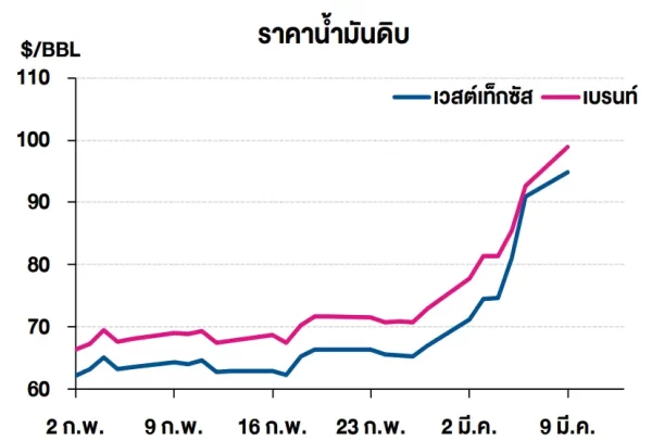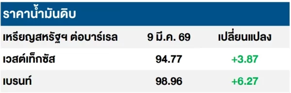 (+) ราคาน้ำมันดิบเวสต์เท็กซัสและเบรนท์ปรับตัวเพิ่มขึ้น จากความกังวลต่ออุปทานน้ำมันดิบที่ยังคงตีงตัวอย่างต่อเนื่อง หลังจากประชาชนอิหร่านบางกลุ่มได้ออกมารวมตัวด้วยการเดินขบวนบนท้องถนนเพื่อประกาศสนับสนุน โมจตาบา คาเมเนอี ผู้นำสูงสุดคนใหม่ของอิหร่าน ซึ่งเป็นการส่งสัญญาณถึงความมุ่งมั่นของประชาชนอินหร่านในการต่อต้านการโจมตีจากสหรัฐฯ และ อิสราเอล นอกจากนี้บริษัทน้ำมันของซาอุดิอาระเบีย เริ่มลดกำลังการผลิตน้ำมันดิบ เนื่องจากข้อจำกัดด้านพื้นที่จัดเก็บและเส้นทางขนส่งที่ยังคงปิดอยู่ ซึ่งเป็นการลดกำลังการผลิตเพิ่มเติมจากประเทศสหรัฐอาหรับเอมิเรตส์ อิรัก คูเวต และกาตาร์