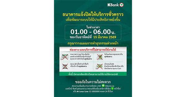 มิติหุ้น – ธนาคารกสิกรไทยแจ้งปิดให้บริการชั่วคราว เพื่อพัฒนาระบบให้มีประสิทธิภาพยิ่งขึ้น ในวันอาทิตย์ที่ 15 มีนาคม 2569 เวลา 01:00 น. – 06:00 น. โดยช่องทางและบริการที่ไม่สามารถใช้งานได้ ดังนี้