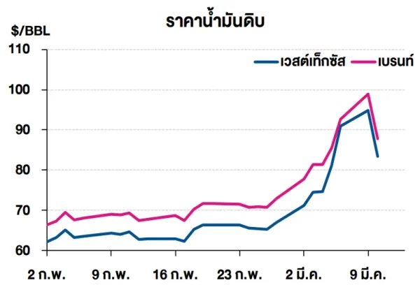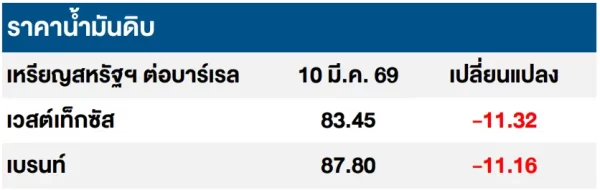 (-) ราคาน้ำมันดิบเวสต์เท็กซัสและเบรนท์ปรับตัวลดลง หลังรัฐมนตรีว่าการกระทรวงพลังงานสหรัฐฯ ได้กล่าวว่า กองทัพสหรัฐฯ ได้มีการอำนวยความสะดวกในการขนส่งน้ำมันออกจากช่องแคบฮอร์มุซ นอกจากนี้ ประธานาธิบดีสหรัฐฯ โดนัลด์ ทรัมป์ คาดการณ์ว่าสงครามในตะวันออกกลาง อาจยุติลง ในเร็ววัน โดยกล่าวกับสำนักข่าว CBS เมื่อวันที่ 9 มี.ค. 69 ที่ผ่านมา ว่าสงครามกับอิหร่านใกล้สิ้นสุดแล้ว รวมถึงรัฐมนตรีการต่างประเทศอิสราเอลได้กล่าวว่า อิสราเอลไม่ต้องการทำสงครามกับอิหร่านไปตลอด และจะประสานงานกับสหรัฐฯ เกี่ยวกับกำหนดเวลาที่จะยุติการสู้รบ ซึ่งช่วยคลายความกังวลต่อการหยุดชะงักของอุปทานน้ำมันดิบทั่วโลกที่ยืดเยื้อ ในขณะที่โฆษกของกองกำลังพิทักษ์ปฏิวัติอิหร่าน หรือ IRGC ได้กล่าวตอบโต้ประธานาธิบดีสหรัฐฯ เมื่อวันที่ 10 มี.ค.69 ที่ผ่านมาว่า อิหร่านจะเป็นผู้กำหนดจุดจบของสงครามและจะยังคงจำกัดการส่งออกน้ำมัน หากสหรัฐฯ และ อิสราเอล ยังคงโจมตีต่อไป