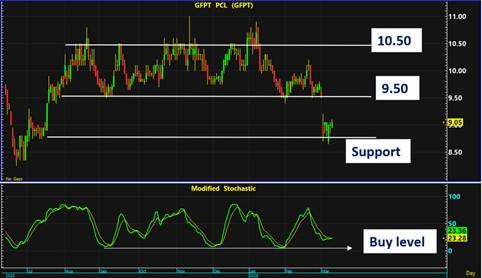 กราฟ GFPT อ่อนตัวลงสู่แนวรับสำคัญ และเริ่มสร้างฐานได้แล้ว ขณะที่ Stoch อยู่ในแนว Support ที่มีการดีดตัวขึ้นทุกครั้ง ดังนั้นจะทำให้กราฟปรับตัวขึ้นไปยังต้านแรก 9.50 และ 10.50 บาท ต่อไป